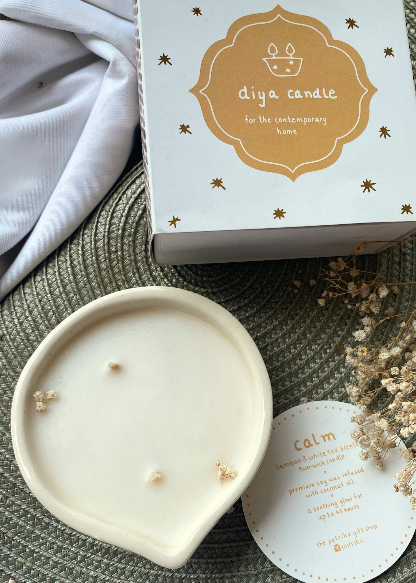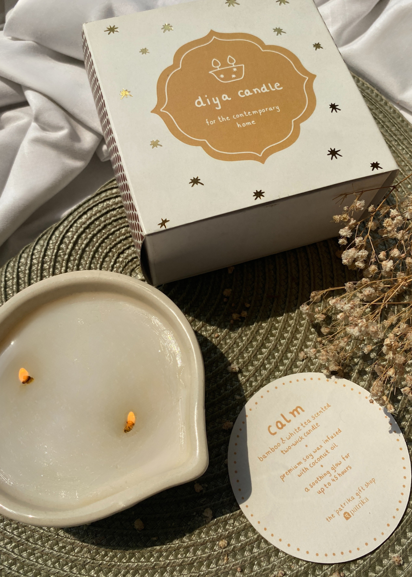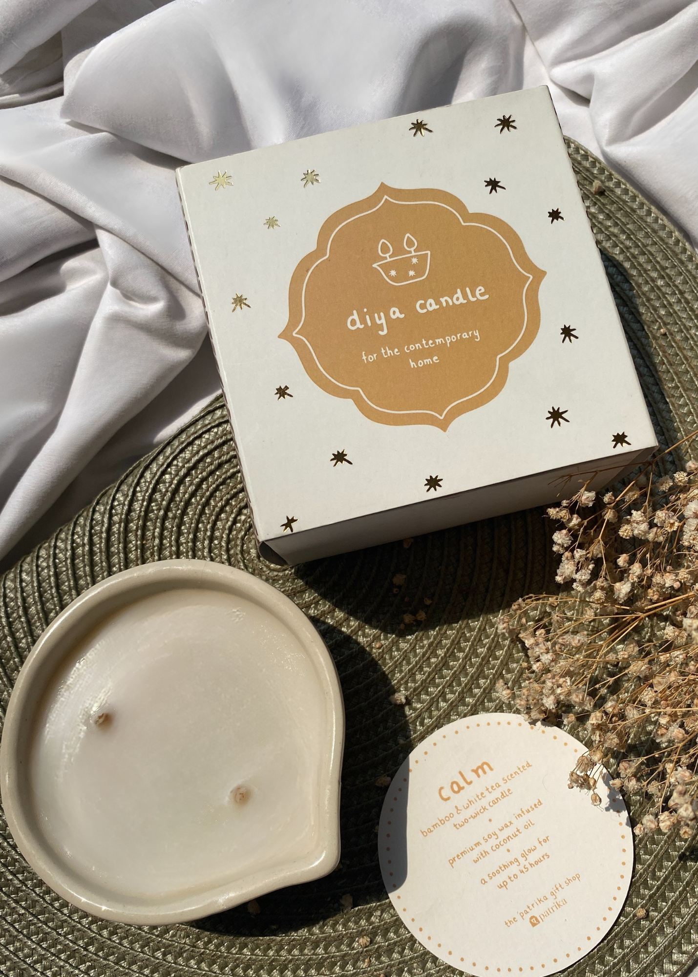 Handcrafted in a minimal white ceramic diya, Calm is our bestselling candle. It's simple, serene, and soothing. Infused with a clean, grounding fragrance of bamboo and white tea, it’s designed to bring a moment of calm to your everyday.