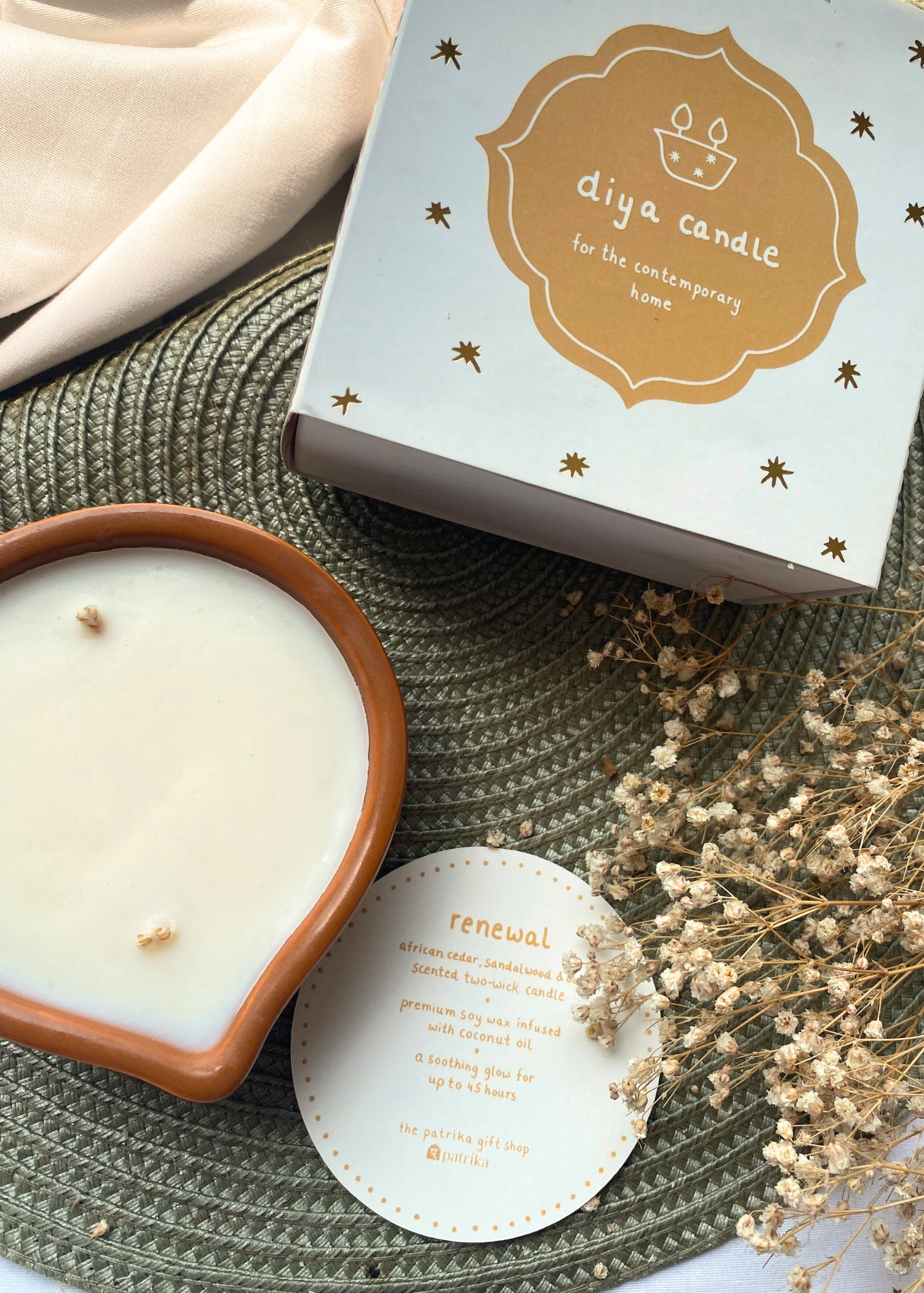 Handcrafted in an earthy terracotta-hued ceramic diya, Renewal brings warmth, depth, and a sense of rootedness to your space. With a rich, meditative blend of African cedar, sandalwood, and oud, this candle invites you to slow down and reconnect, perfect for transitions, resets, or simply winding down.
