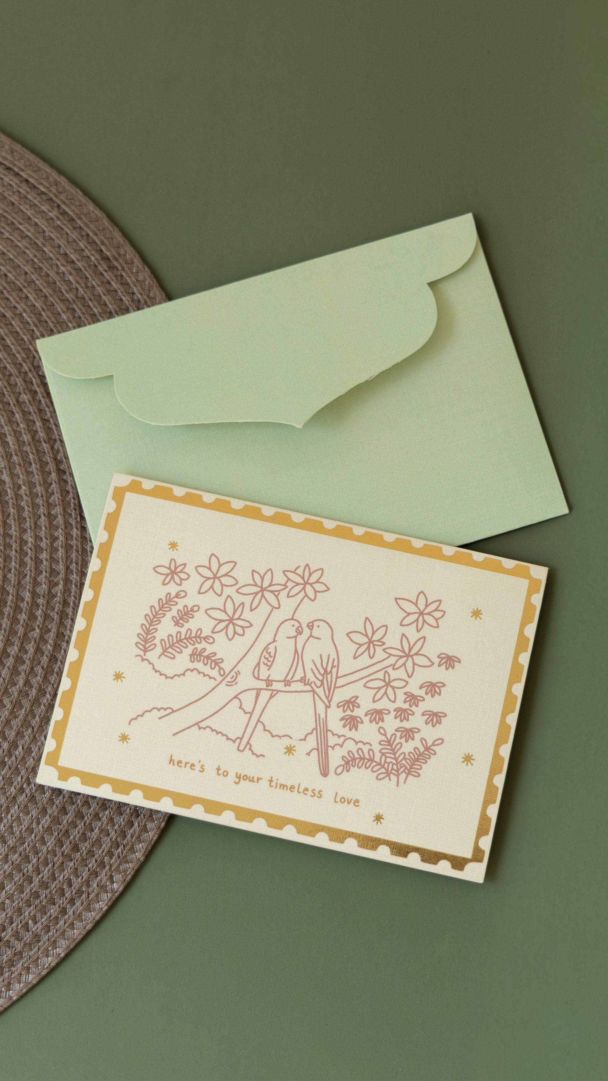 🎨 Two gently hand-drawn Nicobar Parakeets in a soothing dusty rose give the card a timeless and romantic aesthetic. ✨ Gold-foiled stamp & starry accents on the front and back for a touch of celebration.