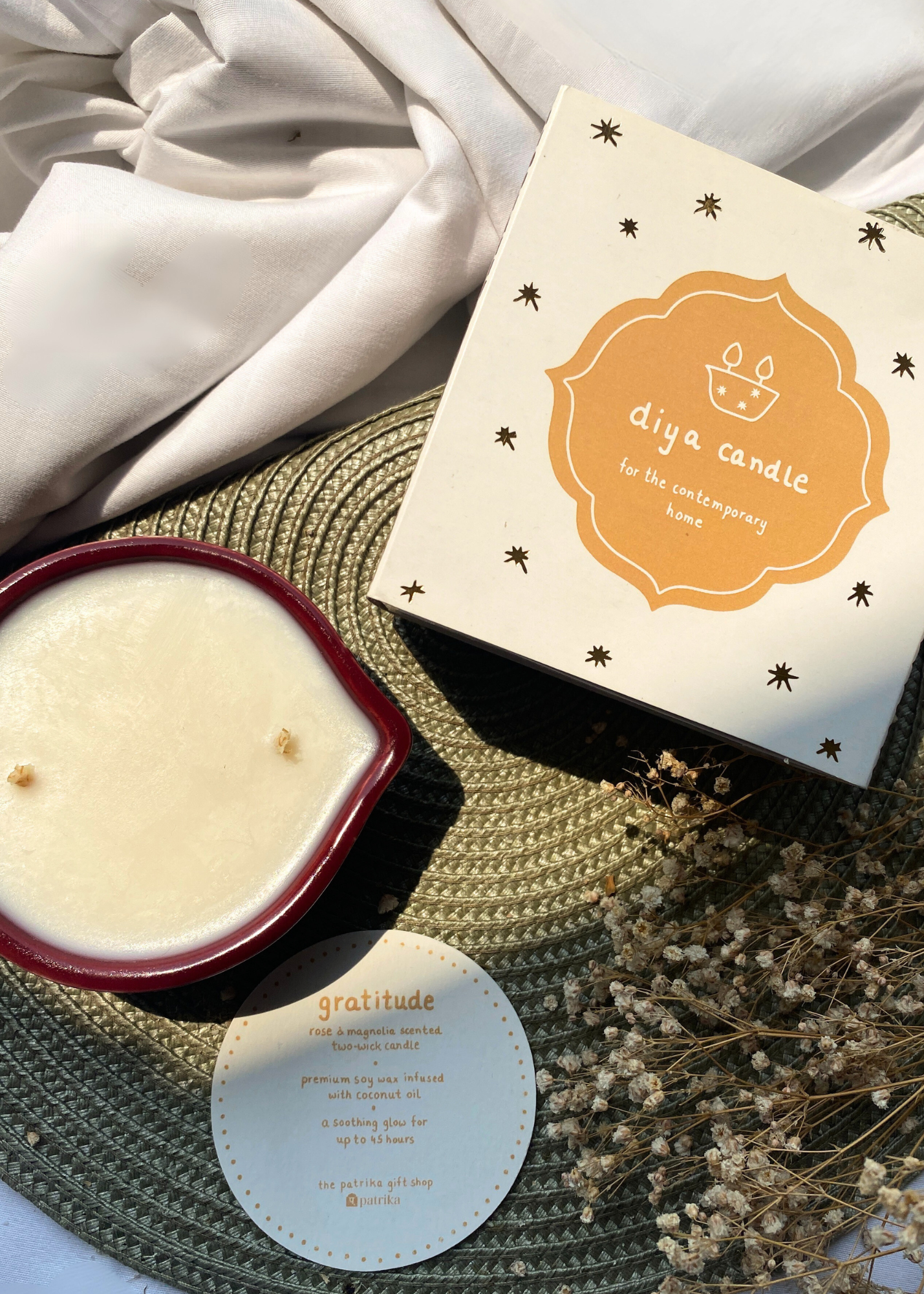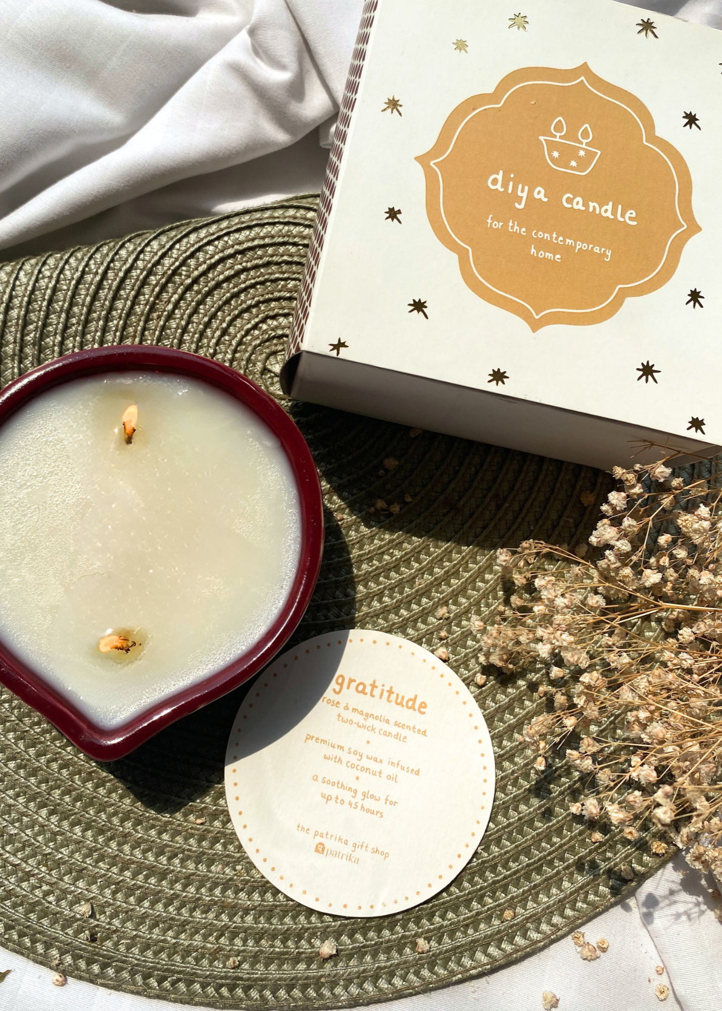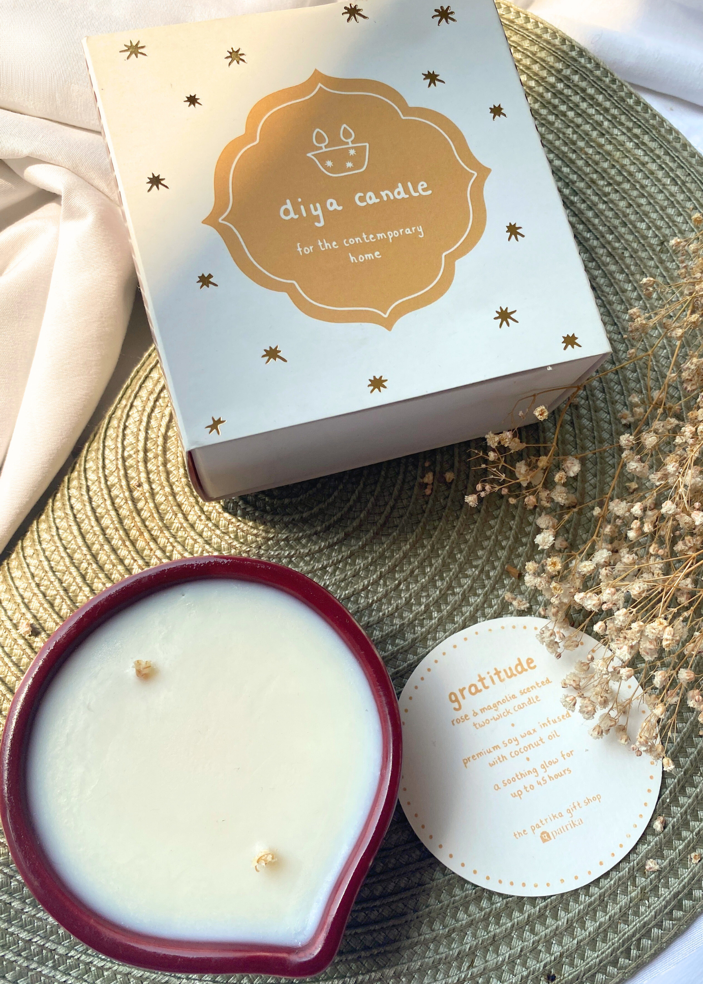 Handcrafted in a rose-hued ceramic diya, Gratitude carries the delicate elegance of fresh blooms. With a romantic blend of rose and magnolia, this candle fills your space with warmth, tenderness, and grace, perfect for moments of reflection or thoughtful gifting.