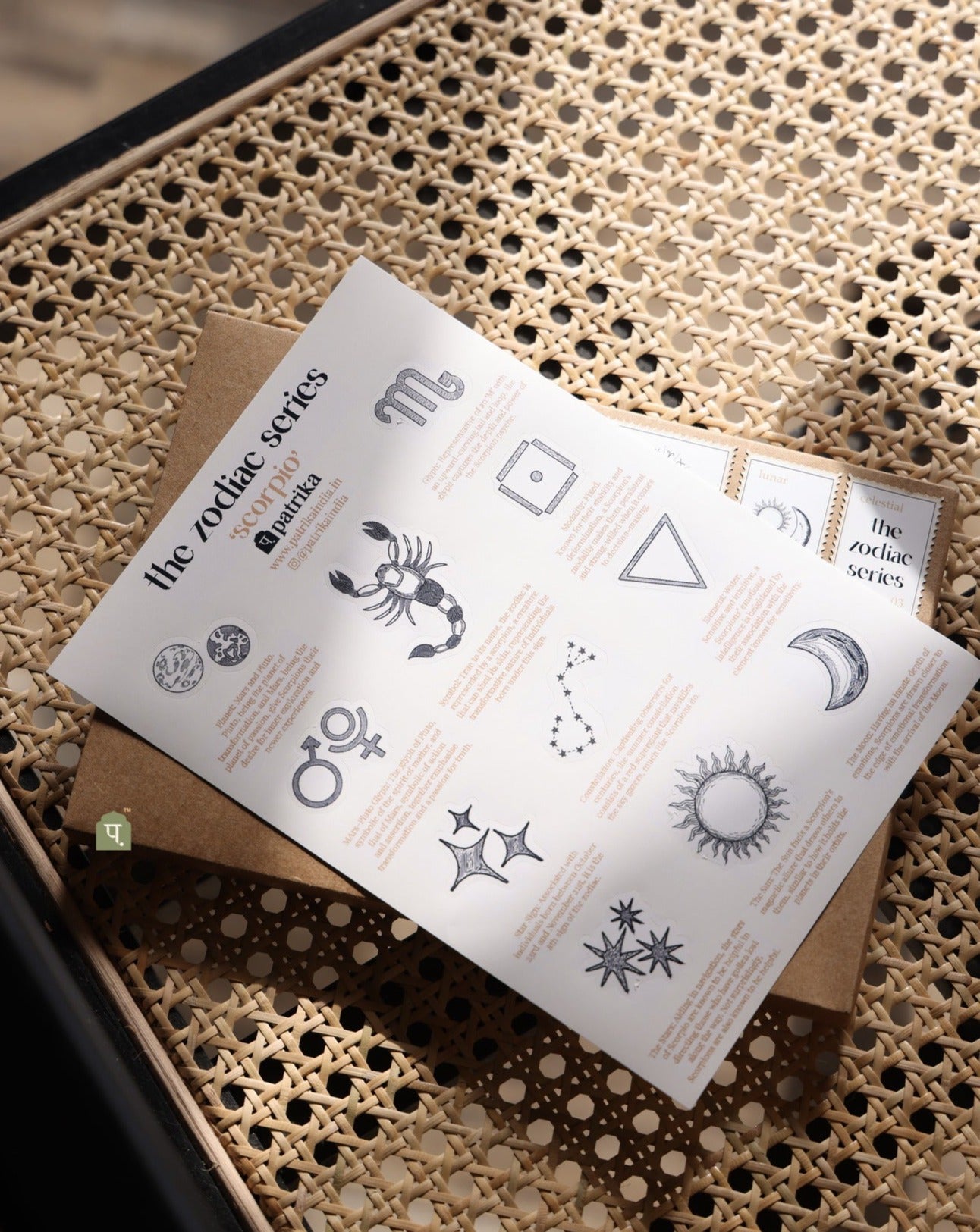 It is an elegant addition to any stationery/ sun sign lover's collection. The cover has symbols & elements that are tied to the Scorpio sign. It also comes with a sticker sheet that explains the symbolism behind all the different elements & why they are linked to the sign.
