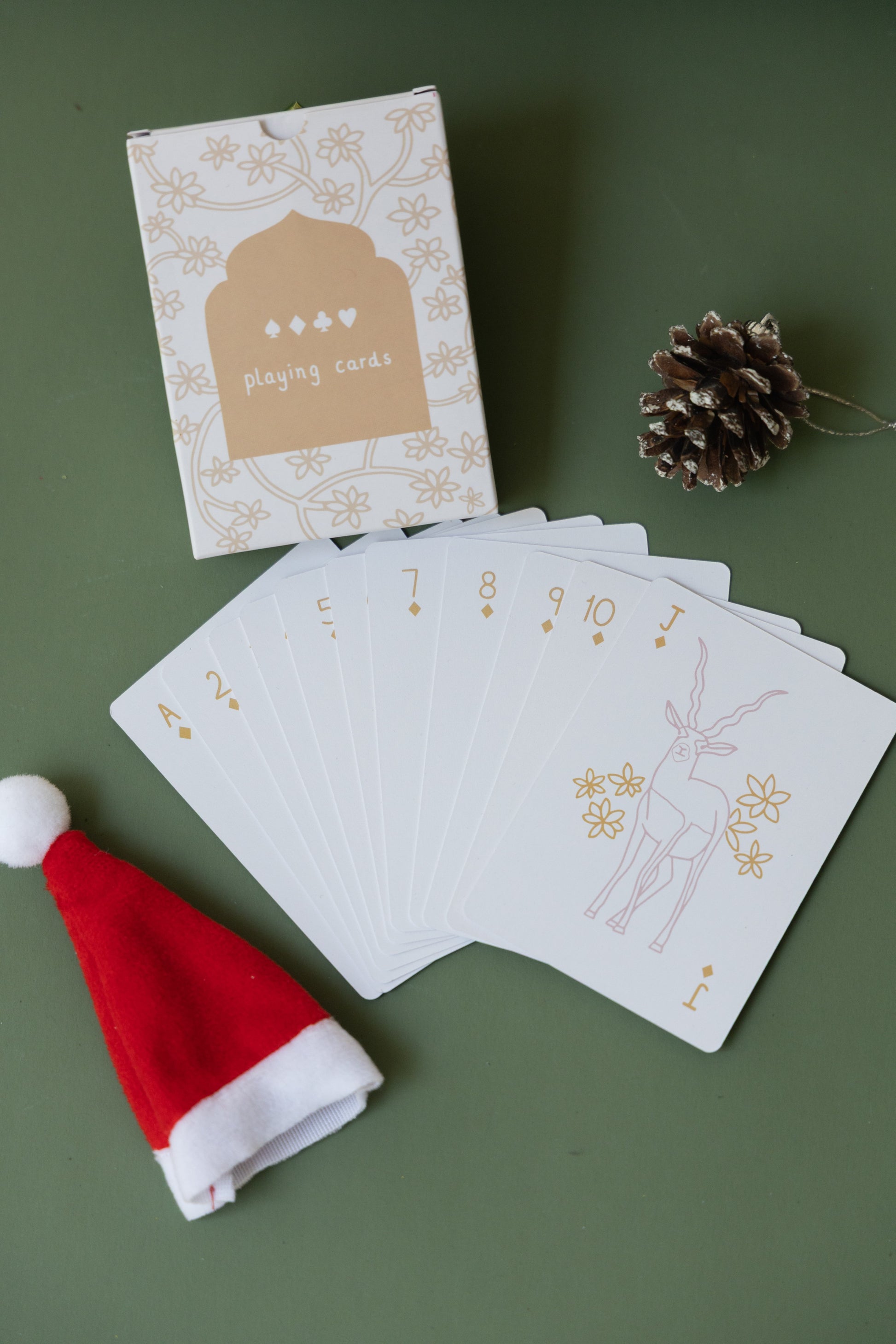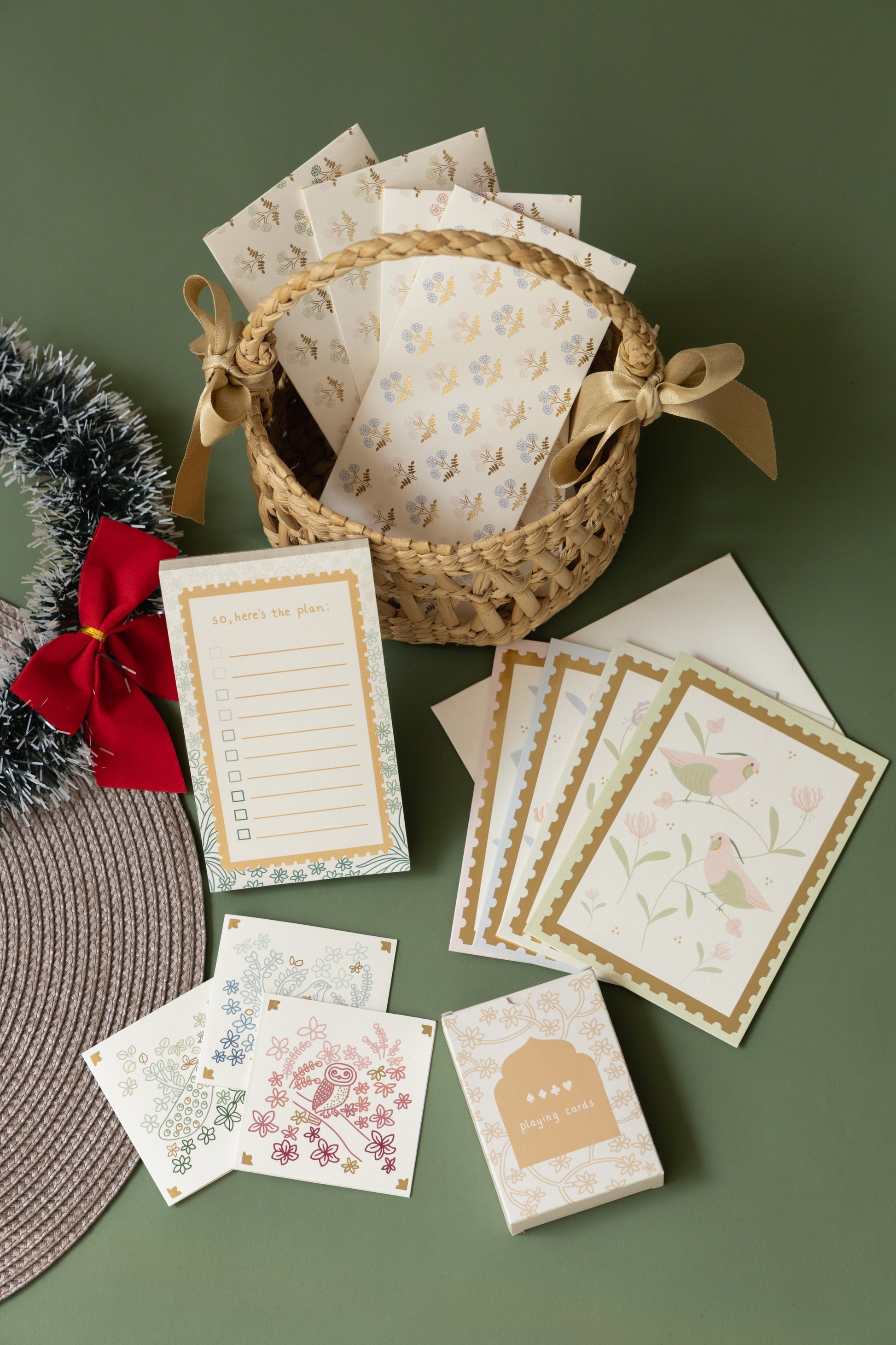 A thoughtfully curated hamper that brings together the beauty of India’s endangered wildlife & the richness of its artistic heritage. The India in Bloom Hamper features some of Patrika’s most meaningful creations: a set of our Wildscape Revival playing cards, the “So Here’s the Plan” notepad for effortless organisation, and a set of four illustrated greeting cards showcasing the Green Peafowl, Forest Owlet, Finn’s Weaver & Himalayan Quail, all endangered species native to India. Each card is paired with a gold-foiled damselfly embossed envelope, another delicate species under threat.